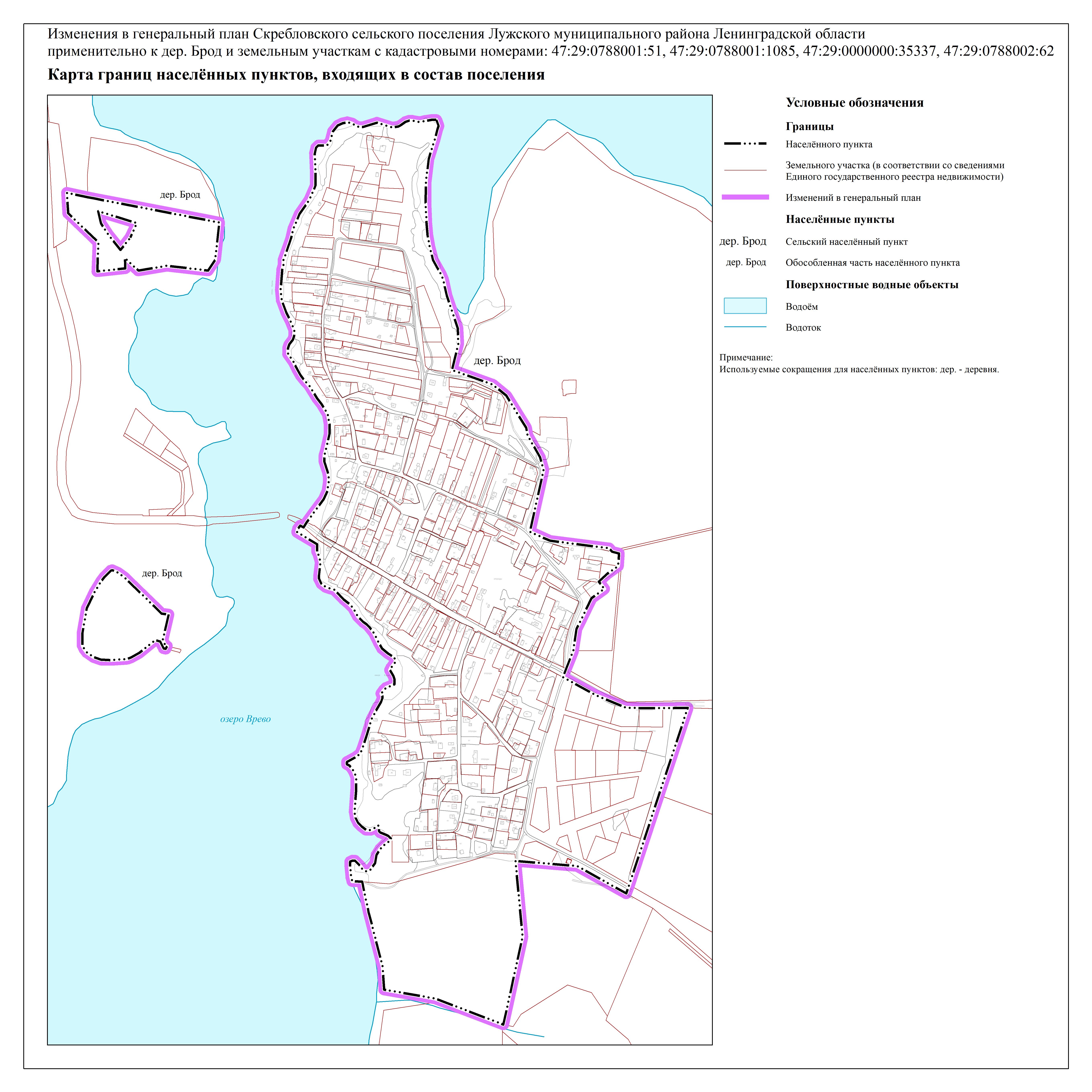 Проект постановления Правительства «О внесении изменений в Генеральный план Скребловского сельского поселения Лужского муниципального района Ленинградской области применительно к деревне Брод и земельным участкам с кадастровыми номерами: 47:29:0788001:51, 47:29:0788001:1085, 47:29:0000000:35337, 47:29:0788002:62»